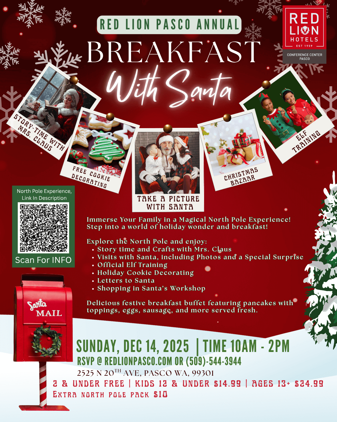 Enjoy a Breakfast Buffet with Santa! Pancakes, toppings, eggs, sausage,  plus more! Plus stroll through Red Lion Pasco’s Holiday Bazaar, take pictures with Santa & decorate cookies!