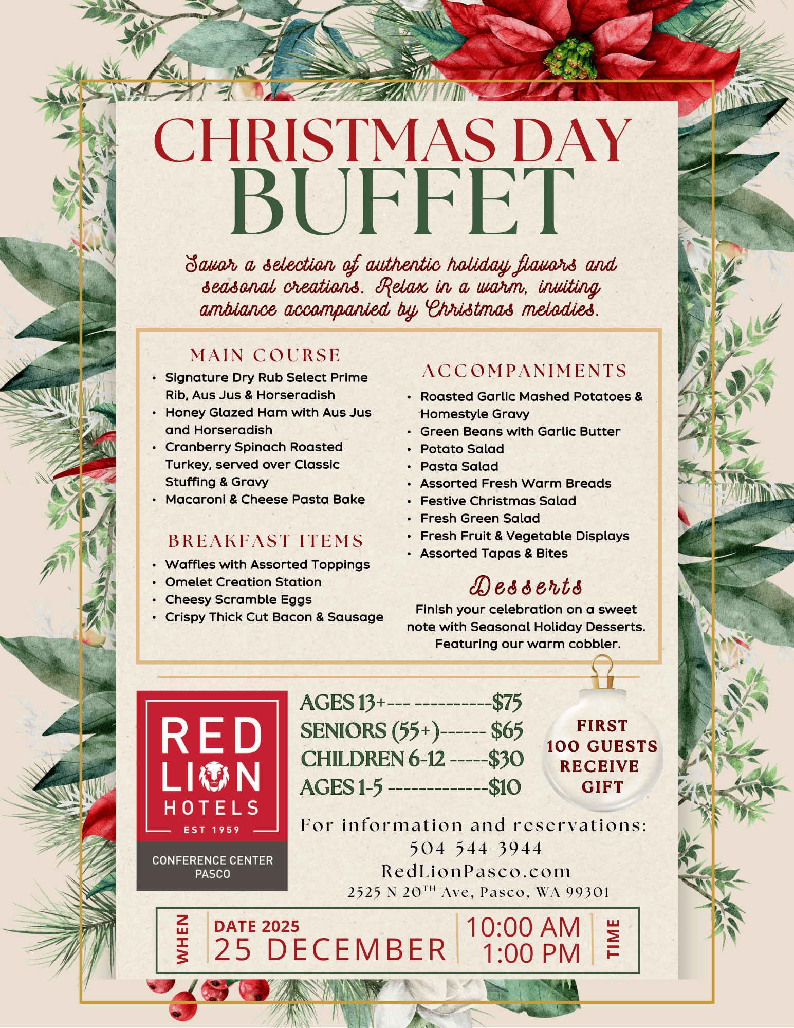Join us for a festive Christmas-themed buffet and celebrate precious holiday moments with your family. Enjoy a delicious variety of holiday classics, breakfast favorites, and seasonal desserts.